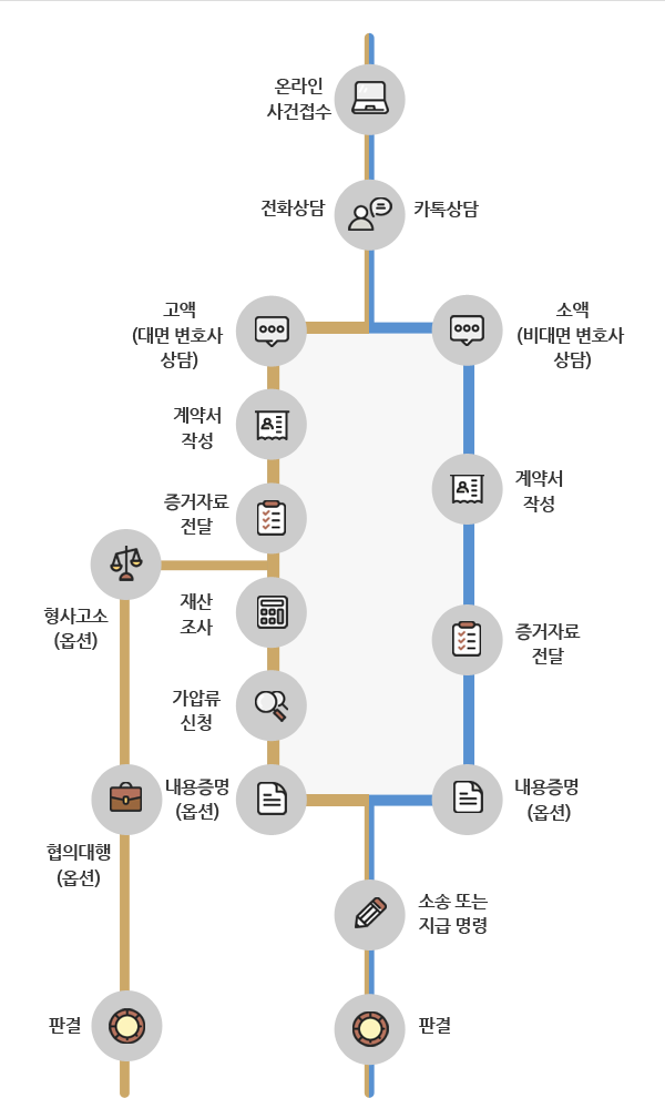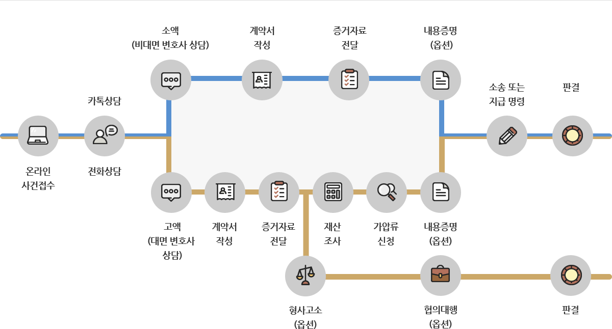 대면, 비대면 상담이 가능해 의뢰인의 선택 폭을 높였으며 지급명령과 소송 등의 방법으로 채권회수 가능성을 높였습니다.
